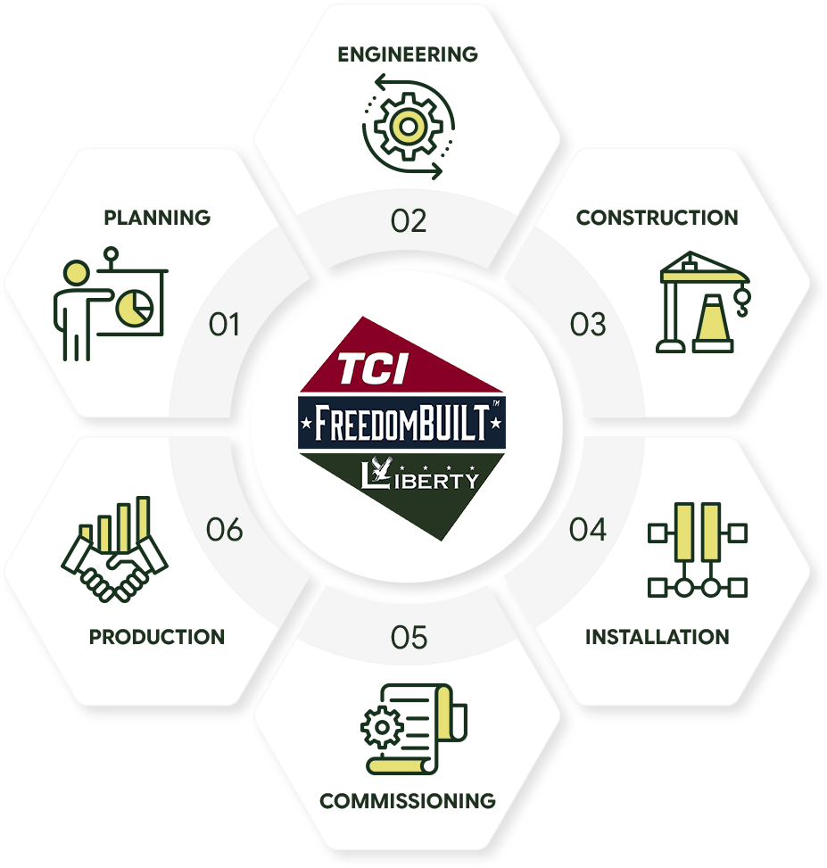 TCI Manufacturing then develops the engineered layout and equipment package, while Liberty prepares the site, foundations, structures, and mechanical installation plan.