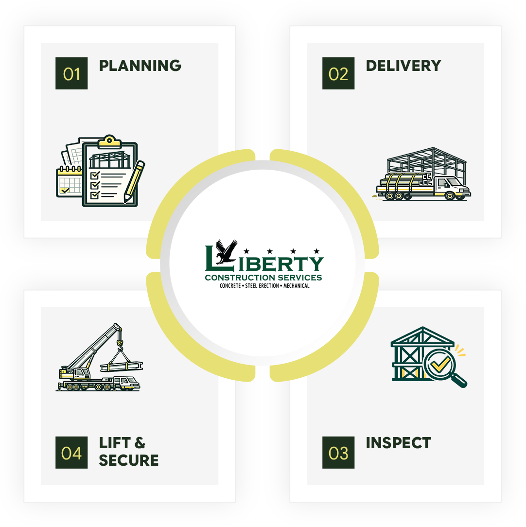 Liberty Construction Services delivers safe, accurate, and durable steel erection to support long-term industrial operations.